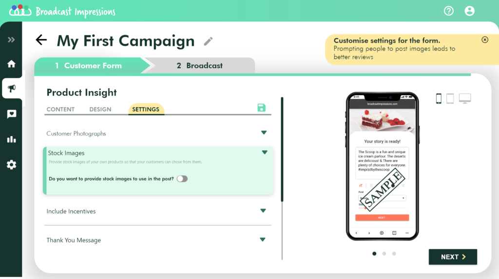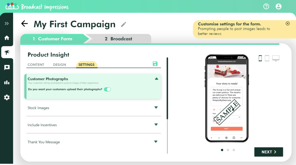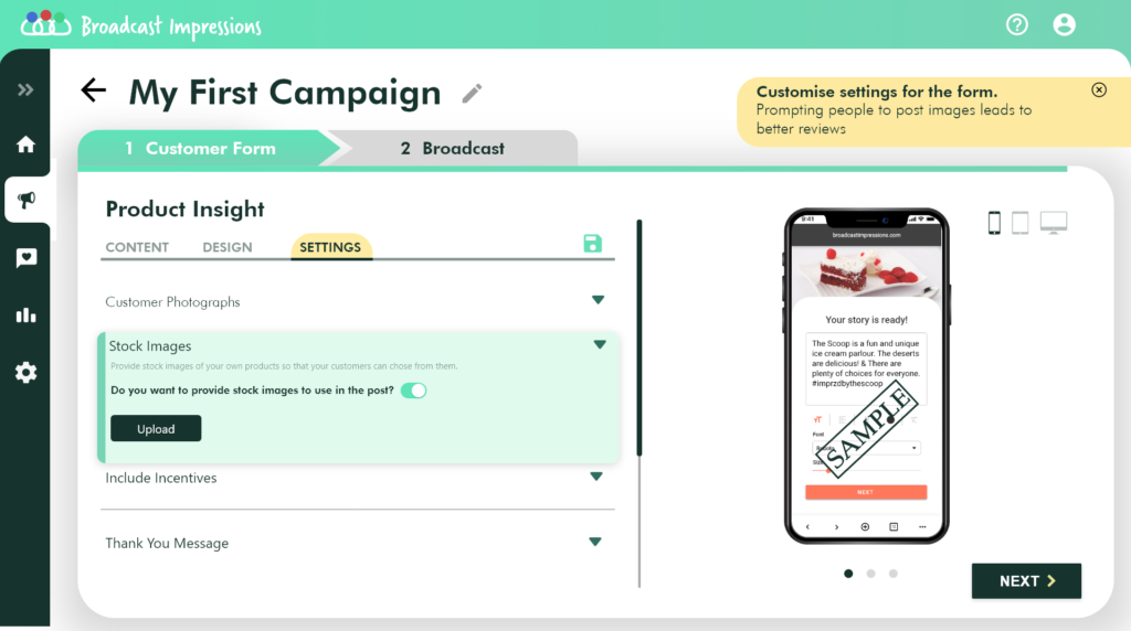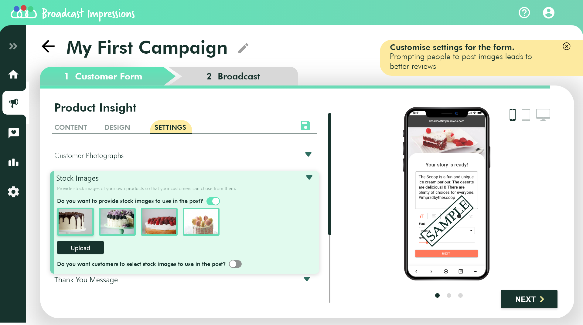 On the settings tab, you will have the ability to upload stock images, let your customers choose or upload a picture, attach coupon codes and add a Thank you note.