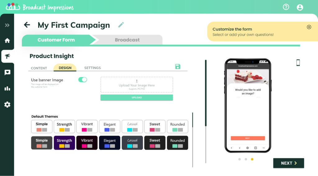 On the Design tab, you can add a banner image and choose a theme to further customize your form.