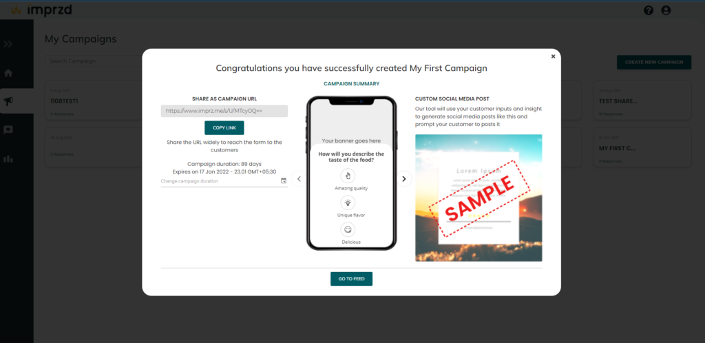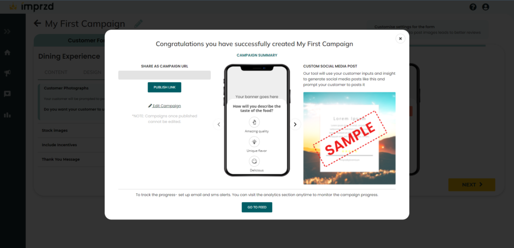 Click on the ‘Publish Link’ button on the LHS, Now your campaign is live and a link will be displayed in the box under ‘Share as campaign URL’. This link can be shared with your customers.