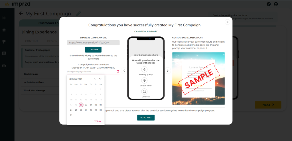 You also have the option to set the campaign duration. By default this is set to 3 months, from the date of publishing. To change the campaign duration, click on the calendar icon and set a date upto which you would like the campaign to be live.